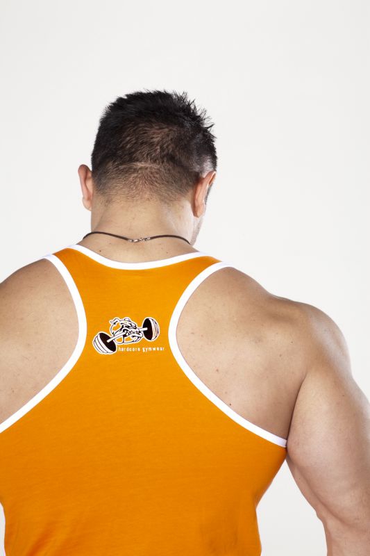 Данная модель представляет собой классическую майку-борцовку. Но среди других подобных изделий она выделяется за счет оранжевого цвета. Так что если хотите наполнить свою повседневность яркими красками, этот выбор будет самым удачным! Фасон майки не только удобен для физических нагрузок, но и демонстрирует красивое тело в выгодном свете.